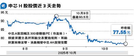 中國收緊稀土出口管制後,美國總統特朗普暗示可能限制某些設備對華出口,昨天午後中國再宣布對美國船舶收取船舶特別港務費,市場憂慮中美博弈惡化,重磅科技股續遭拋售,於9月累升53%的阿里巴巴(9988)收市跌4.56%,成交額升至311.7億元,佔大市總成交9.34%,股價已連跌4日,累跌10.64%。新華匯富金融(0188)披露本周共售阿里巴巴10萬股,套現約1085萬元,收益約100萬元。中芯國際(0981)遭內地券商調整其融資融券折算率為零(見另文),意味無法以中芯股票作抵押融資(即借孖展),中芯H股收市跌7.13%。不過,華泰證券將中芯H股目標價上調88.9%,至119元,維持「買入」評級,因看好內地國產AI芯片帶動代工需求增長。