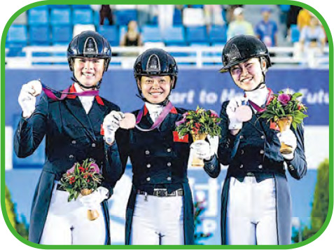 2023年杭州亞運,港隊代表蕭鶻(左起)、何苑欣和陳萃彥於馬術盛裝舞步團體賽贏得銅牌。