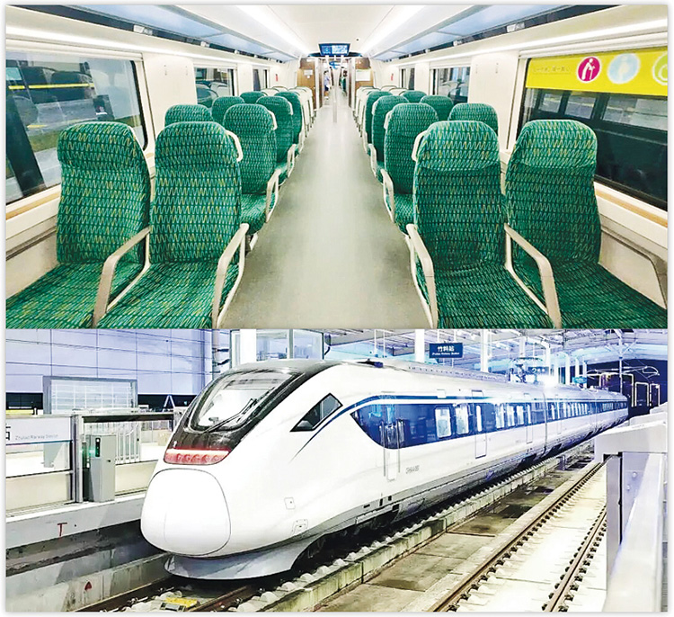 廣州東環城際採用和諧號列車(下圖)及類似火車的座椅排列(上圖),但由廣州地鐵運營。(網上圖片)