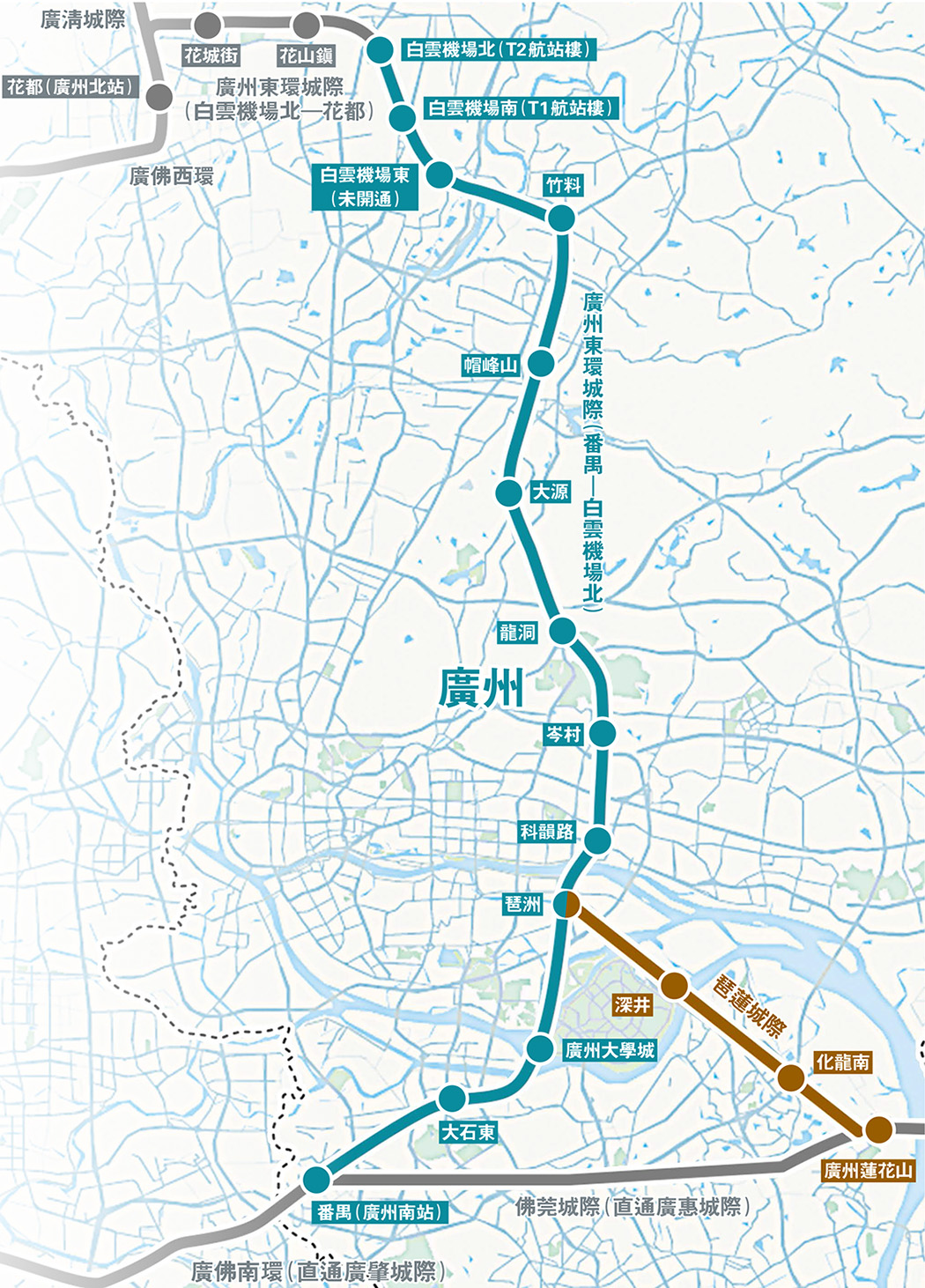 兩條新開線路原名「新白廣城際(北段)、廣佛東環」及「穗莞深城際琶洲支線」(見7月1日A11),廣州市政府9月中正式定名「廣州東環城際鐵路(番禺—白雲機場北)」及「琶蓮城際鐵路」。廣州東環城際鐵路(番禺—白雲機場北)全長57.8公里,設13座車站,南至北依次是番禺(廣州南站)、大石東、廣州大學城、琶洲、科韻路、岑村、龍洞、大源、帽峰山、竹料、白雲機場東(未開通)、白雲機場南(T1航站樓)、白雲機場北(T2航站樓)。琶蓮城際鐵路全長18.2公里,設琶洲、深井、化龍南、廣州蓮花山4座車站。