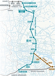 兩條廣東城際新路線廣州東環城際鐵路(番禺—白雲機場北)(淺藍色)、琶蓮城際鐵路(棕色)今日中午12時通車,圖為開通的兩個鐵路的途徑站點。