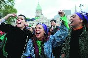 阿根廷布宜諾斯艾利斯的支持墮胎權人士上周六參加「國際安全墮胎日」遊行,並為較早前3名疑遭販毒集團報復而受酷刑和謀殺的女子討公道。(路透社)