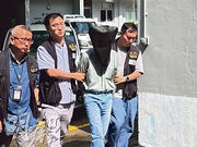 60歲男子(蒙頭者)涉嫌在海關社交平台專頁上,發布煽惑他人縱火及意圖焚燒法庭的言論,前日(9月29日)被警方拘捕。(林智傑攝)