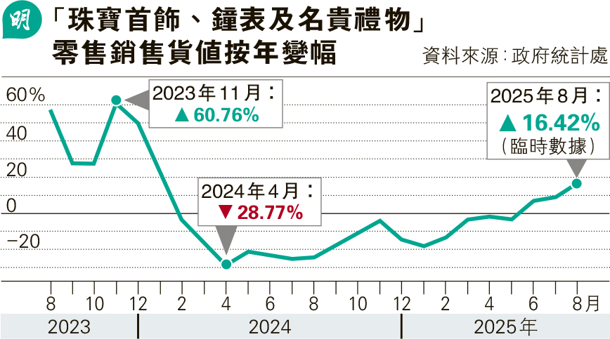 【明報專訊】政府統計處昨日公布,本港8月零售銷售額按年增3.8%,好過市場預期的增長2%,連升4個月,升幅為2023年12月後新高;銷貨值錄得303.26億元,為今年第三高月份。各類商品中,珠寶首飾銷貨值按年勁升16.4%最搶鏡。香港零售管理協會主席謝邱安儀稱,零售業已進入較平穩狀態,普遍對國慶黃金周「信心不錯」,超過八成協會會員預計期內銷貨額將至少持平或有單位數以致低雙位數上升,整體審慎樂觀。
