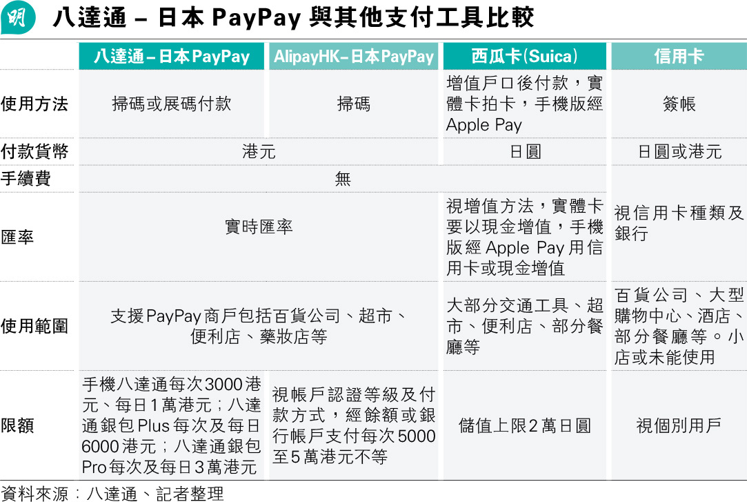 翻查資料,AlipayHK 2020年起與PayPay合作,同樣透過掃碼以港元實時匯率付款,對比八達通與AlipayHK連結PayPay、西瓜卡及信用卡,前兩者均由港元實時兌款,後兩者則可以日圓付款。至於信用卡設海外簽帳手續費,但部分信用卡免手續費或提供回贈。AlipayHK除可用付款,亦支援日本叫車、租車及購買日本鐵路和新幹線車票(見表)。