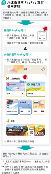【明報專訊】港人遊日有新電子支付方式。八達通昨宣布,八達通App新增日本PayPay電子支付選項,港人於日本任何有「PayPay」商標的店舖,經八達通App出示或掃描PayPay二維碼,便可經手機八達通或八達通銀包以港元付款,全程零手續費及享優惠匯率。八達通預計,整體而言可較在當地用信用卡簽帳節省2%至3%。