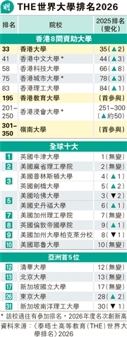 【明報專訊】英國《泰晤士高等教育》(THE)今日公布2026年度世界大學排名,本港續有5間大學位列全球百強,排名皆升,其中香港大學位列第33名,按年升兩位,蟬聯本地大學之首,亦是亞洲第6、全國第3位。中大、城大、浸大排名創該校新高,教大和嶺大首上榜(見表)。THE回覆本報稱,港8間資助大學的國際化表現出眾,歸因各校招攬大量來自內地的學生和教職員。