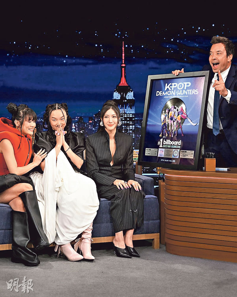 提起《Kpop獵魔女團》,戲中HUNTR/X成為首支奪得美國Billboard Hot 100單曲榜冠軍的韓國女團,幕後代唱主題曲《Golden》的女歌手Ejae、Audrey Nuna及Rei Ami繼上月擔任美國VMA頒獎嘉賓,前晚再獲邀亮相NBC清談節目《The Tonight Show》,首度現場演唱此曲,更從名嘴占美科倫手上接過白金唱片,他說:「能夠成為首位告知你們奪得白金唱片的人,我深感榮幸。」身兼作曲人的Ejae表現興奮,忍不住眼泛淚光。戲中聲演女團主音Rumi的《合夥人之路》女星趙雅頓(Arden Cho)亦透過社交媒體留言讚好:「我愛你們,HUNTR/X一起出發吧!」