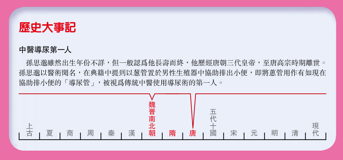 孫思邈雖然出生年份不詳,但一般認為他長壽而終,他歷經唐朝三代皇帝,至唐高宗時期離世。孫思邈以醫術聞名,在典籍中提到以b管置於男性生殖器中協助排出小便,即將蔥管用作有如現在協助排小便的「導尿管」,被視為傳統中醫使用導尿術的第一人。