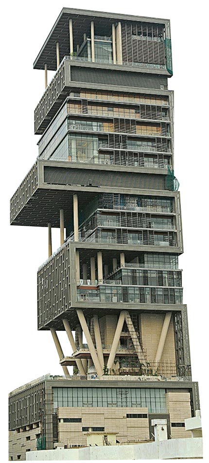 安巴尼一家五口居住在印度孟買豪宅「安迪利亞」(Antilia)。安迪利亞樓高173米,共27層,面積逾3.7萬平方米,是目前全球最大的私人寓所。大宅內有168個車位、3個直升機坪、多個游泳池、健康水療中心、宴會廳,以及50個座位的劇院等設施,由600名員工打理。
