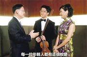 李靖甫(右)近年加入亞洲青年弦樂團,今年國慶文藝晚會更踏上紅館,與香港弦樂團同台演奏《粵劇幻想曲》。(李家超fb影片截圖)