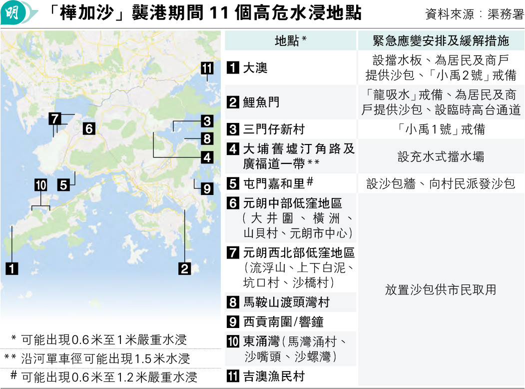 渠務署昨聯同土拓署及民政總署召開聯合記者會,渠務署長莫永昌說,該署評估預料全港有11個地方水浸情G較嚴重,大部分或出現0.6至1米水浸(見圖),當局提早部署應變及緩解措施,並已制定行動計劃,以大澳為例,署方已將擋水板升高,同時在擋水板後築起沙包;若仍有海水滲入,雨水泵房會及時抽走海水,政府亦已協助大澳居民在門口加裝擋水板,並提供大量沙包,築起第三道屏障。