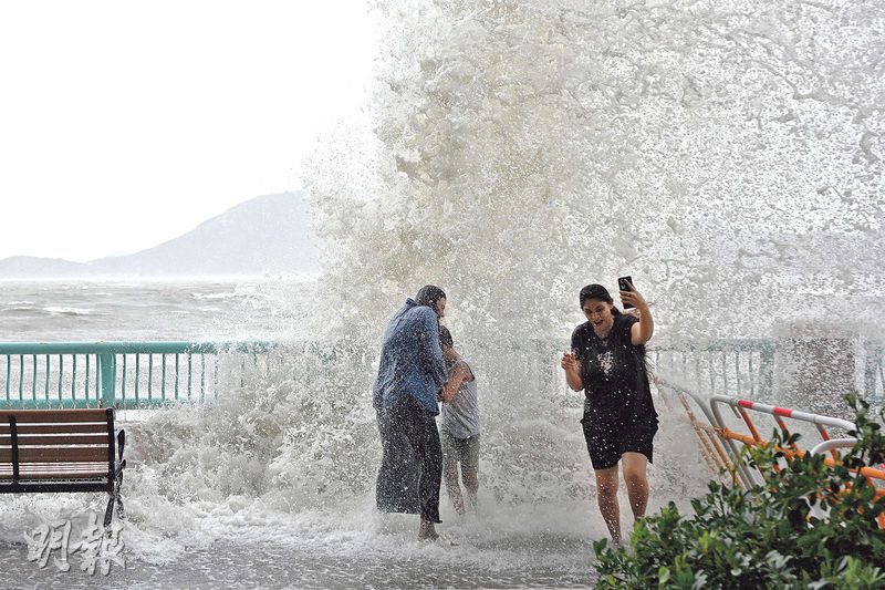 警方及消防均在facebook呼籲,極端天氣期間如非必要切勿外出甚至冒險追風,應留在安全地方,保護自身安全。不過昨早10號風球生效時,本報記者於南區海怡半島岸邊見到不少人觀浪,其中3名非華裔人士拍照時有巨浪拍上岸,3人瞬即被吞噬,幸有驚無險只跌坐地上。記者所見當時巨浪約3個成年人高,其中一名年輕女子走避時顧荌祀|手機,另一女子則護茖k童,男童被}跌後驚慌哭泣。