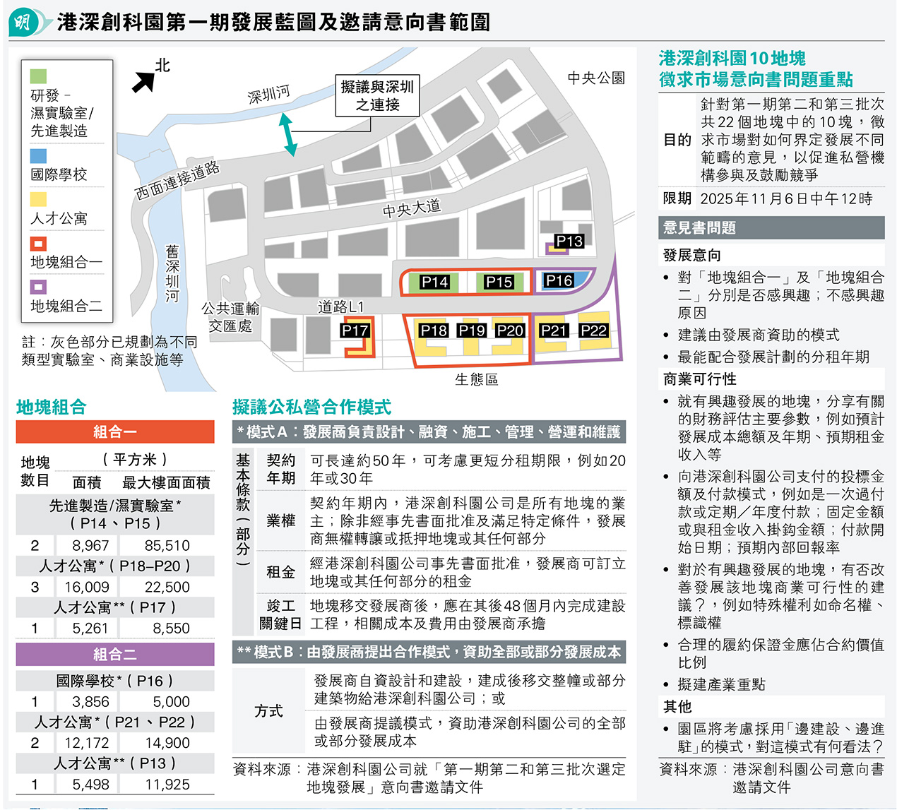 就兩個組合的發展模式,港深創科園公司指定不同地塊,分別有兩種建議。建議一是由發展商負責設計、融資、施工、管理、營運和維護,在此安排下契約年期最長多達50年,其間業權歸港深創科園公司;發展商可訂立地塊或其任何部分的租金,事前須獲該公司書面批准。