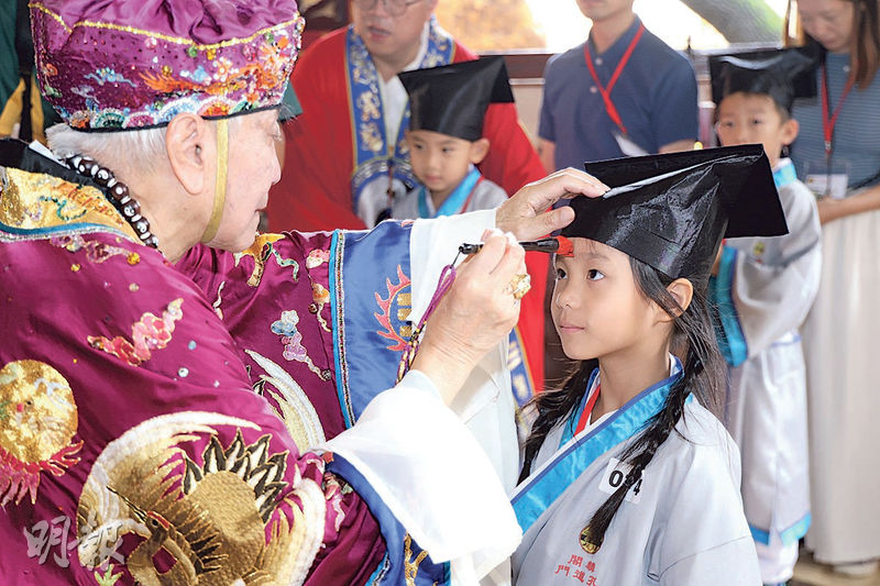 孔子被視為「萬世師表」,盧鳴東說民間傳統有「開筆禮」,學生祭拜孔子先師,以及被視為發明毛筆的「筆祖」蒙恬;學生潔淨雙手,再由負責主持開學禮的校長等人以「朱砂開智」,取「痣」、「智」同音,以紅色顏料在學生的眉心點一點紅痣,寓意他們將充滿智慧,開學後學習事半功倍。