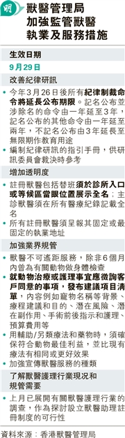 獸醫管理局昨提出9項加強監管指施(見表)。增加透明度方面,局方稱會延長紀律制裁命令的發布期,涉及獸醫除名的裁決會延長至刊登3年、其他「開名」的紀律裁決延長至兩年;不記名裁決由刊登3年延長至無限期作教育用途,適用於今年3月26日後裁決。局方亦要求替班在內的獸醫須在執業診所入口或等候區當眼位置展示全名;主診獸醫須在所有診症和護理程序的醫療紀錄載列全名;局方又會編制紀律研訊及裁決指引供研訊委員會參考。