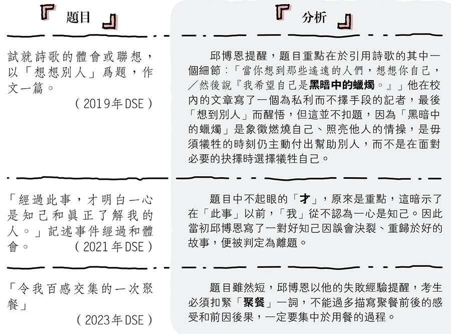 儘管喜歡以科學的頭腦認知世界,邱博恩並非以議論文在卷二寫作奪星,而是主攻記敘抒情文。但他在寫作卷的表現也曾經飄忽,原因是未有捉緊關鍵細節,他形容一些字眼看似不起眼,卻可能會導致離題。請他來回顧以往「敗績」,分析關鍵詞:(表)