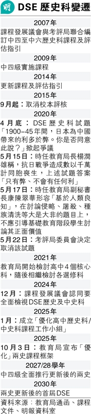 高中雙史將更新,增加中國近代史篇幅,首批影響是2027年9月讀中四的學生。根據教育局公布新課程框架,歷史科五大單元將重整。現時學生分別學習香港史、中國史、日本史,探討三者如何現代化與蛻變,但新課程除在「中國與世界:國家走向現代化及成為國際重要成員的歷程」設獨立單元教授中國史,不再有香港史、日本史單元。
