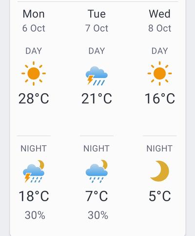 【明報專訊】多倫多今日天晴晚間或有驟雨,氣溫攝氏18度至28度,明日天陰或有雷雨,氣温攝氏7度至21度,後日天晴氣溫攝氏5度至16度。