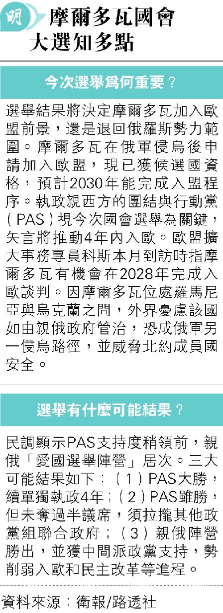 東歐國家摩爾多瓦周日(28日)舉行國會大選,其結果將牽引該國能否在2030年或之前加入歐盟,還是被俄羅斯拉回勢力範圍。執政親歐洲和西方「團結與行動黨」(PAS)出身的總統桑杜形容今次選舉是摩國「史上最重要的選舉」,正受到俄羅斯歷來最強力干預的陰霾籠罩,包括斥資數以億計歐元「買票」,招攬滋事者煽動「暴力,散播假資訊和恐懼」。選前有74人涉往塞爾維亞接受俄軍訓練而被捕。親俄派政治人物則抗議政府打壓民眾聲音和限制俄語廣播。