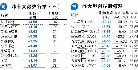 內地股市假期休市,港股通暫停,直到下周四復市。不過,瓻高開後一路向上,即市回調在27,118點獲得支持後再次上攻,尾市一度升526點至27,381點,最終收報27,287點,全日升431點或1.6%。然而,氣氛並非全面亢奮。《明報》港股數據庫覆蓋的股份中,上升的不足六成,其中有近兩成半升逾3%,反映買盤動力集中,並偏好大型股及強勢主題。中小型股昨明顯乏力,琤秅中p型股指數僅升0.8%。科技股續成升市火車頭,琤肮鴔獂數升3.4%。數據庫追蹤多個科技細分行業表現亮眼,科技器材升4.6%,金屬與礦石升4.2%,新能源產業升3.6%。汽車、醫療保健及軟件服務表現同樣不錯,升幅介乎1.4%至2.4%之間。值得留意,焦點主要落在強勢科技股,如騰訊(0700)升2%再破頂,阿里巴巴(9988)升3.5%、百度(9888)升4.5%、中芯(0981)升12.7%。快手(1024)繼上日向上突破後昨天再升9%。美團(3690)則續獨憔悴,全日僅升1.2%。