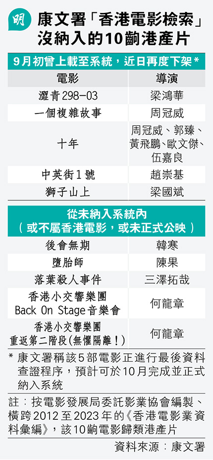 ¦¹¥~¡A¥»³ø¤ñ¹ï·í§½©e°U¼v·~¨ó·|½s»s¡B¾î¸ó2012¦Ü2023¦~ªº¡m»´ä¹q¼v·~¸ê®Æ·J½s¡n¡Aµo²{µLªk¦b±d¤å¸pªº¡u»´ä¹q¼vÀ˯Á¡v¨t²Î·j´M¡m¤Q¦~¡n¡A¥H¤Î¨ú§÷¦Û¤»¤C¼É°Ê¤Î«B³Ê¹B°Êªº¡m¤¤^µó1¸¹¡nµ¥¹q¼v¸ê®Æ¡C¸p¤è±µÀò¥»³ø¬d¸ß«á¡A´¿©ó¤W¤ëªì¤W¸ü¡m¤Q¦~¡n¦b¤º5ÄÕ¹q¼vªº¸ê®Æ¡Aªñ¤é¦A¦¸¤U¬[¡C±d¤å¸p¦^ÂÐ¥»³ø½T»{¡A¦³10ÄÕ¹q¼v±q¥¼³Q¯Ç¤J¨t²Î(¨£ªí)¡A¸ÑÄÀ¨ä¤¤5ÄթΤ£ÄÝ»´ä¹q¼v¡A¥t5ÄÕ¡u·|¦b§¹¦¨¬dÃÒ«á¯Ç¤J¨t²Î¡v¡C¦Ü©ó¬°¦ó¦A¦¸¤U¬[«á5ÄÕªº¸ê®Æ¡A¸p¤è¸ÑÄÀ¡A¤W¤ëªì¦]¨t²Î§Þ³N°ÝÃD¡A´¿µu¼È¤W¸ü·s¸ê®Æ´ú¸Õ¨t²Î§ó·s±¡úG¡A¤SºÙ¸Ó5ÄÕ¹q¼v¥¿¶i¦æ³Ì«á¸ê®Æ¬dÃÒµ{§Ç¡A¹wp¥i©ó¥»¤ë§¹¦¨¨Ã¥¿¦¡¯Ç¤J¨t²Î¡C