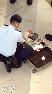 網傳片段顯示,一名背靠牆站立的外籍男子,被兩名警員在左右兩旁按住上身,前方有警員在已開啟的行李篋抽出磚狀物件(圖),並將錫紙、膠袋等包裝拆開檢查,以手機拍照存檔,再把物品放入另一透明袋。