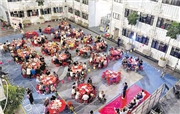 元朗過渡房屋「悅安居」居民日前鶷y場搞中秋盆菜宴,場面熱鬧。(陸頌雄facebook圖片)