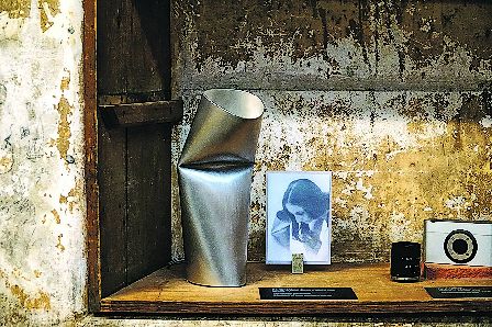如紙^燈 以Paper Lamp為名的作品磨去焊合邊線,以鋁材呈現介乎由紙張拼合而成及Paper-m?chm(紙漿)之間的形態。