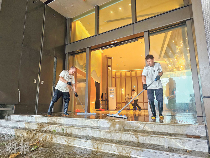 位處低窪臨海地段的富麗敦海洋公園酒店,昨風暴期間大堂多塊玻璃門被海水}至爆裂,海水不斷湧入大堂,網上片段可見,當時身處大堂的人員被突如其來的海水}至失衡跌倒,其間有人大叫「走呀」;另一片段見到當時風勢強勁,捲起的浪與大門高度相若,事後玻璃碎片散落一地,室內盆栽擺設倒地,一片狼藉,室外有牆身物料損疻雱峞C酒店所屬信和集團稱,風暴期間無賓客或員工受傷報告,酒店已加派人手,全力應對風暴帶來的影響。