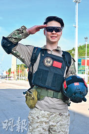 來自深圳現居香港的「軍事迷」陳先生,特意網購約300元軍人服裝,並在頭盔及避彈衣貼上國旗和區旗。適逢國慶登艦參觀,他自言心情激動,期望國家愈來愈富強,人民生活愈來愈好。(盧曼盈攝)