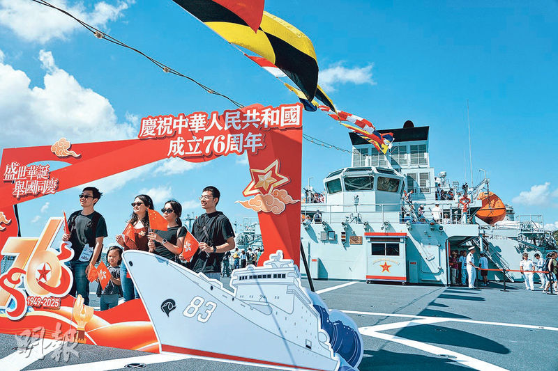 【明報專訊】解放軍海軍戚繼光艦及沂蒙山艦昨在昂船洲軍營第二日開放予公眾參觀,兩艦將於今日離港,前往柬埔寨、泰國和新加坡訪問。兩艦組成的艦艇編隊上月26日至本月8日執行遠海綜合實習任務,昨有受訪海軍學員透露,今次出海約一個月,實習過程鍛煉學員航海基本素養和天文、地文儀器操作等,抵達上述3國後會組織類似艦艇開放活動,組織一些華人華僑和海外愛國人士參加。