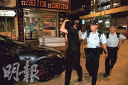 【明報專訊】紅磡石塘街4號昌盛金舖大樓一名業主立案法團成員,昨日零時許發現26歲姓溫男子(圖中黑衫者)在大廈走廊徘徊,懷疑他企圖偷取住戶的衣物和皮鞋,見溫拿起一對鞋時立即喝止,溫隨即將鞋放回地上,法團成員與保安員將溫截住及報警。警方接報到場調查,在溫身上沒有發現可疑物品。警員在溫停泊於附近的Tesla私家車搜查,亦無發現。警方經初步調查,以涉嫌遊蕩將溫拘捕,帶返警署調查。