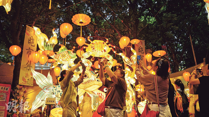 嶺南新天地「新焺遊園」的彩燈以佛山秋色為靈感,遊客紛紛拍照留影。(林迎攝)